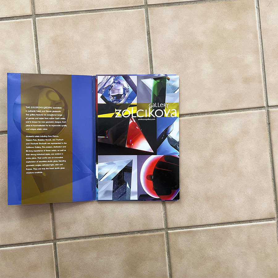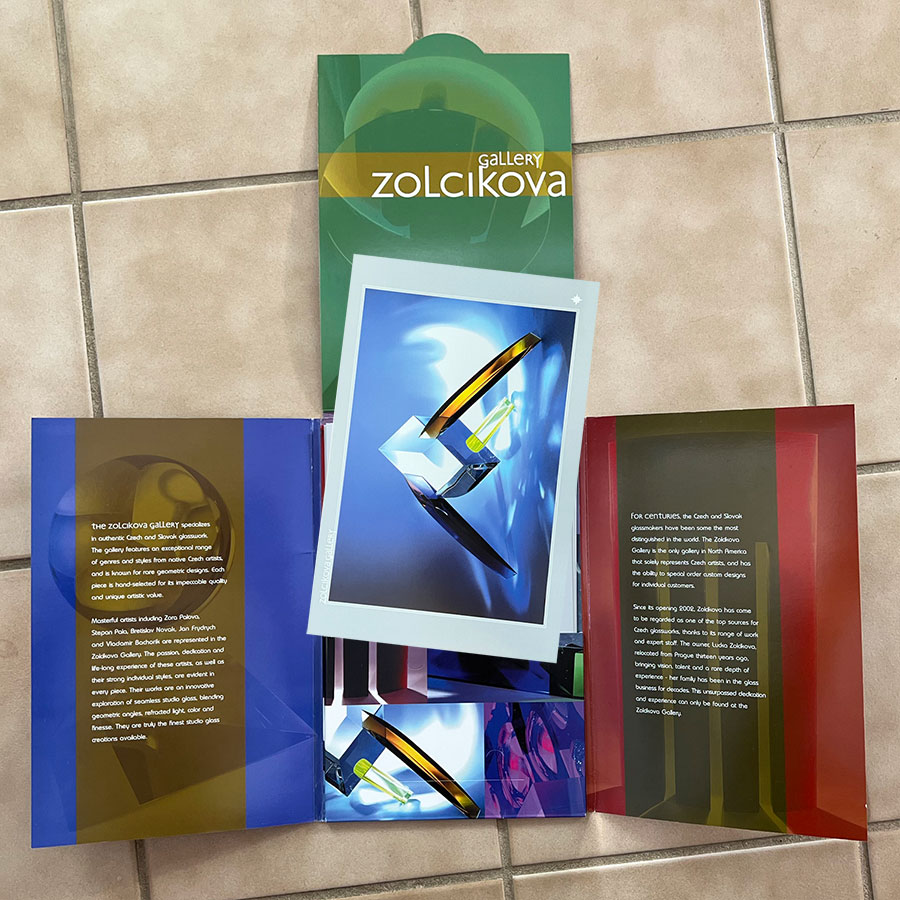 When you sell Czech and Slovak glass, you need a sales kit as distinct as the pieces themselves. Zolcikova Gallery wanted leave-behind cards and a nice way to hold them. adwhirled designed a brochure that folds around a pocket-full of their latest works.